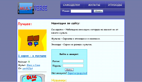 На этом сайте пользователи создают мульты и выкладывают туда серии в формате Флеш. Так же мульты и анимации можно оценивать от 1 до 5 и тем самым попадать выше в списке "Лучшее".